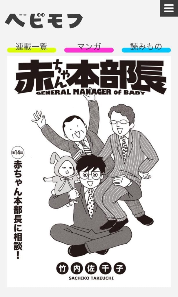 『赤ちゃん本部長』は毎月1日に更新され月末まで無料で読める漫画作品。株式会社モアイに勤める武田本部長47歳がある日突然朝起きると、頭の中はそのままで身体が赤ん坊という状態になり、他の社員が本部長のお世話をしながら仕事を続けるその様子を描いている。