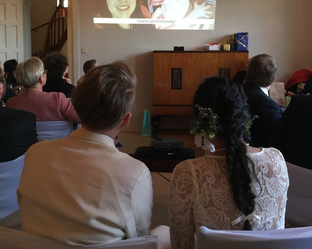 そして実は今回みつぱっぱももうひとりの日本人のお友達と一緒にスピーチをすることになっていた。でもパッパたちのスピーチはわりと手短に。でも、アトレとあやこを見ると、なんか泣いてる。。。もうひとりの子のスピーチがとても素敵だったのだ。。。そしてちょっとしたサプライズを用意していたぱっぱたち。今回ルレオからこの結婚式にこられなかった、あやことアトレの友達や元同僚、語学学校の先生なんかからのビデオメッセージを実はこっそり集めていたみつぱっぱたち。それを編集したものをプロジェクターで流すことに。ふたりとも、笑いながら、涙を流しながら見てくれた。