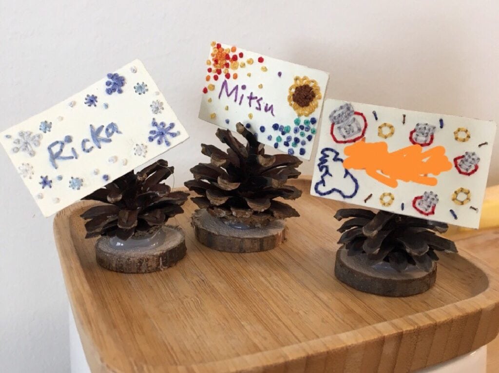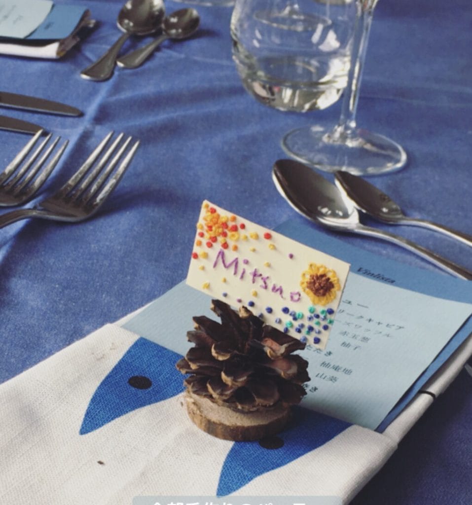 そしてテーブルセッティングもこのクオリティ。ぜんぶこれあやこが作ったらしい。ナプキンも一枚一枚手縫い。そしてネームプレートも一枚一枚、ゲストの個性に合わせて厚紙に刺繍をしたという、ホスピタリティ。