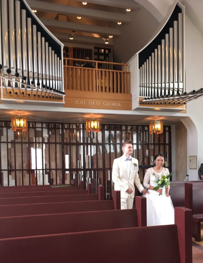 そして今日、式のあるこの教会はアトレのご両親が住んでるところと目と鼻の先の教会。とてもかわいい。教会には続々と人が集まり始め、みんなそれぞれに自己紹介をした。あやこのご家族も日本からいらっしゃってて、ご挨拶をした。時間が近づくにつれ、なかの拝堂へと入って行った。